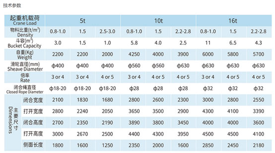 適用于雙索結構式起重機,抓取物料比重在0.6-3.2t/m3各類散貨。